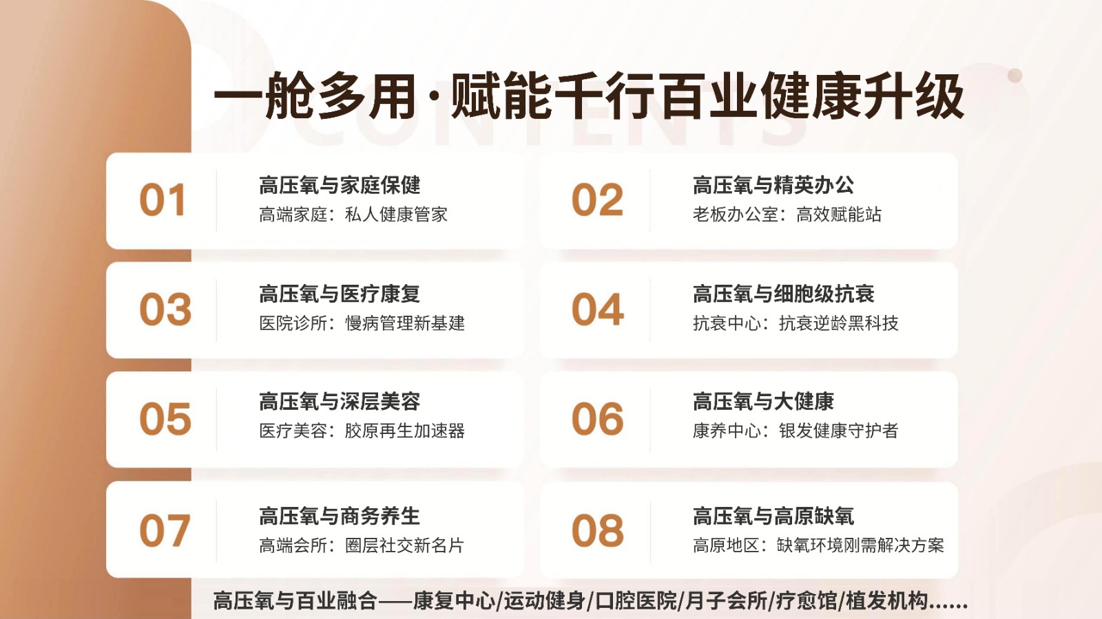 秉承"讓生命煥發(fā)無限生機"的使命,致力于為用戶提供安全、舒適、有效的微高壓氧艙產(chǎn)品,推動全球生命健康事業(yè)發(fā)展。